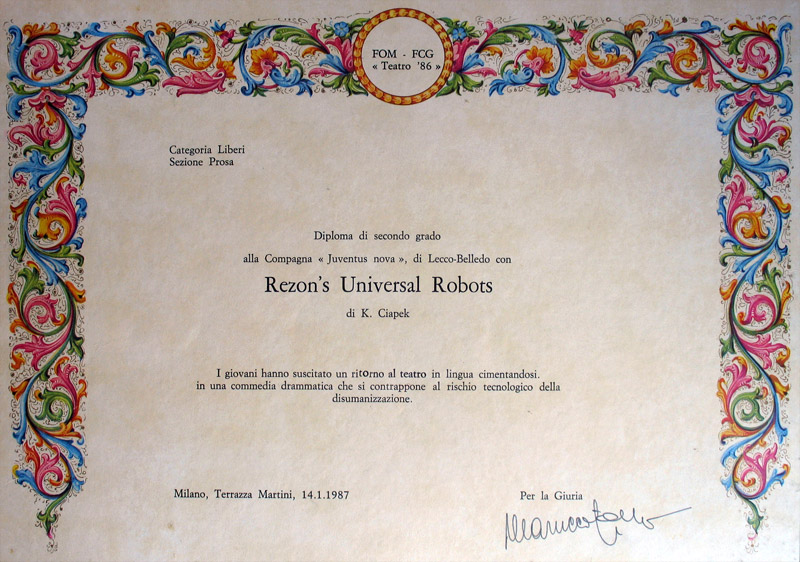 Nel 1986 l'allestimento di REZON'S UNIVERSAL ROBOTS (R.U.R.) di Karel Ciapek, considerato il "kolossal" della Juventus Nova, ci ha consentito di calcare il prestigioso palcoscenico del Teatro della Società di Lecco e di vincere il secondo premio al Concorso Teatrale Diocesano.