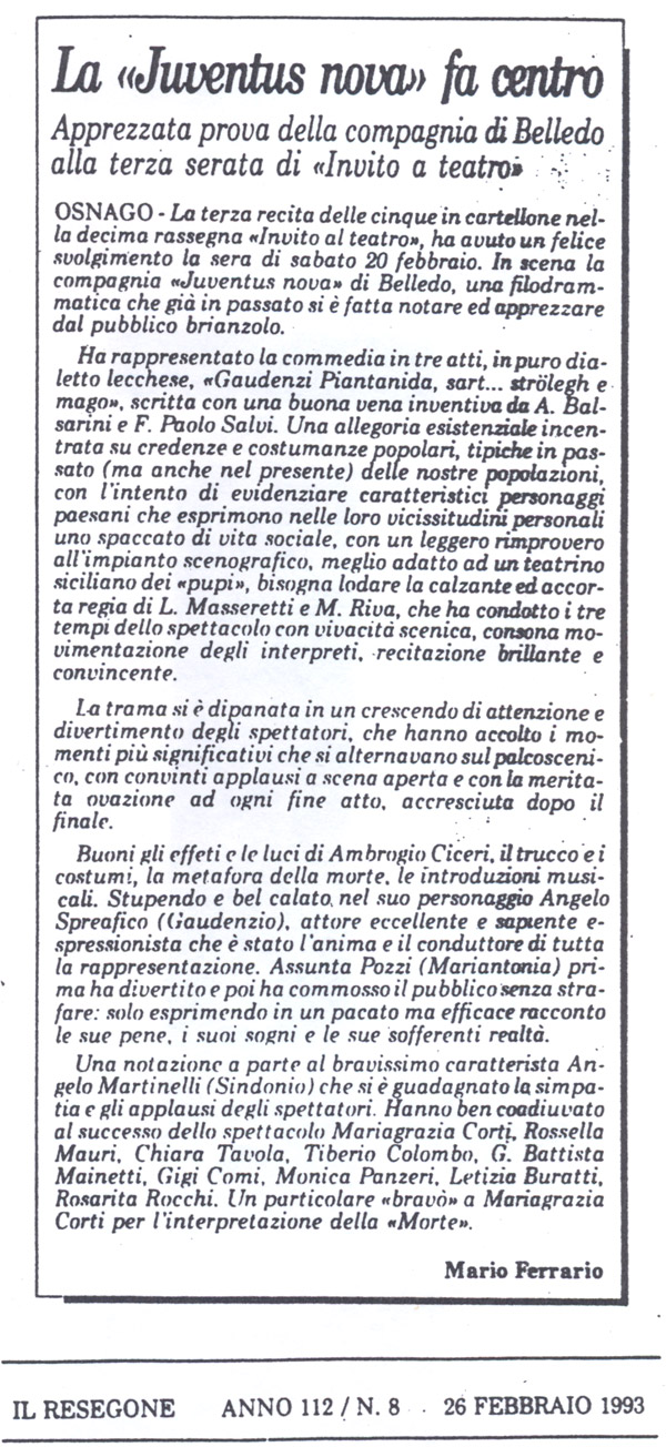 Dopo un periodo di inattività dovuta alla momentanea inagibilità del teatro parrocchiale che viene ristrutturato, le rappresentazioni si aprono nella stagione 1992/93 con un'autentica chicca del teatro dialettale: GAUDENZI PIANTANIDA, SART... STROLEGH E MAGO di Alberto Balzarini e Paolo Salvi, che nemmeno l'autore, con la sua compagnia, era mai riuscito a mettere in scena.